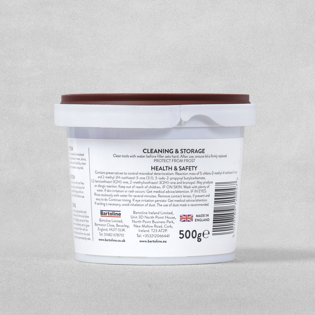 Bartoline Ready Mixed Wood Filler has been formulated for all types of repairs to both interior and exterior wood. The acrylic formulation gives great adhesion with a small amount of flexibility when set, and can be stained, varnished or painted as required. Available in tubs and handy squeezy tubes, in both white and brown shades, allowing direct application to the repair site.
