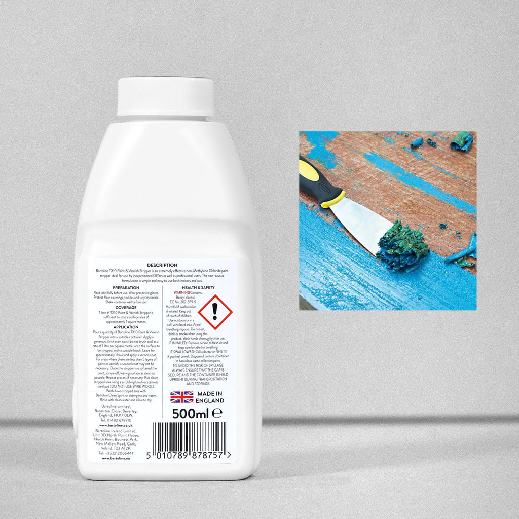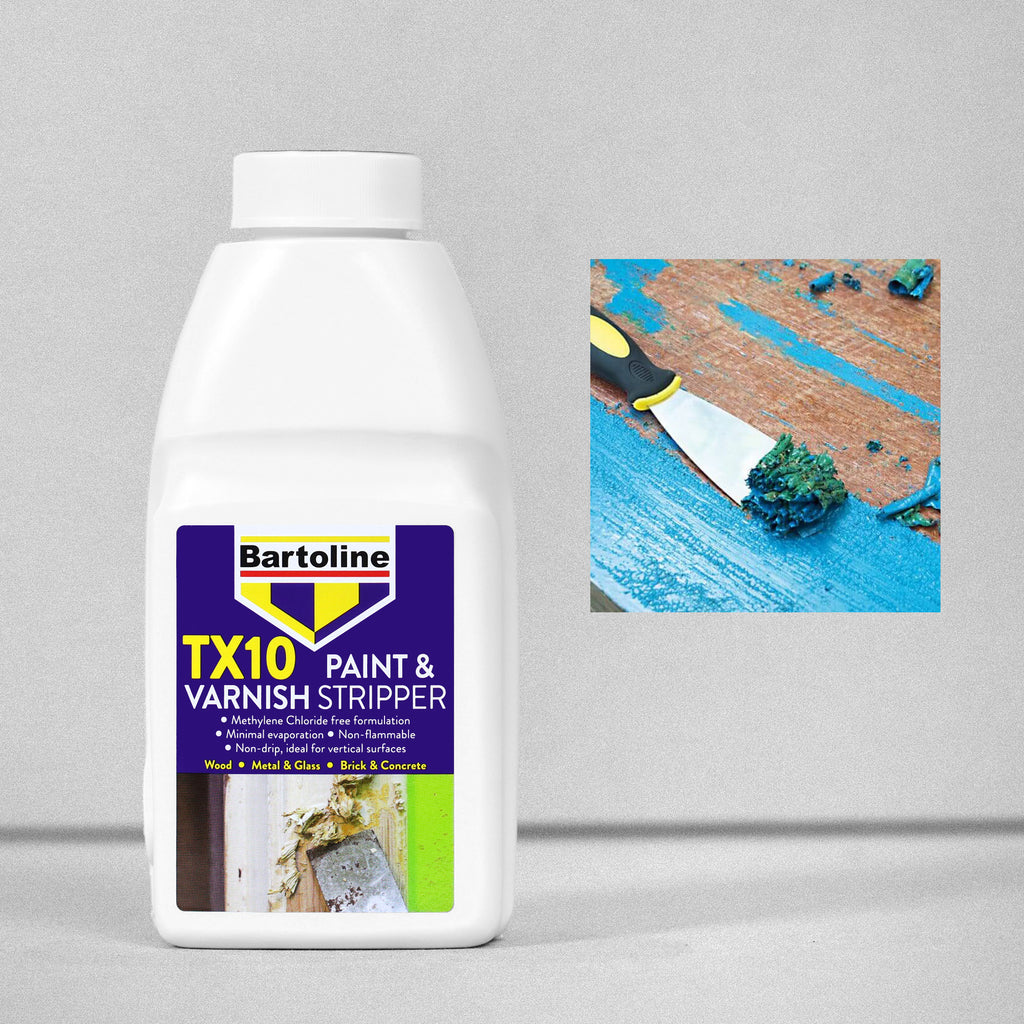 Pour a quantity of Bartoline TX10 Paint and Varnish Stripper into a suitable container. Apply a generous, thick even coat (do not brush out) at a rate of 1 litre per square metre, onto the surface to be stripped, with a suitable brush. Leave for approximately 1 hour and apply a second coat. For areas where there are less than 5 layers of paint or varnish, a second coat may not be necessary. Once the stripper has softened the paint, scrape off, leaving surface as clean as possible. Repeat process if necessary.