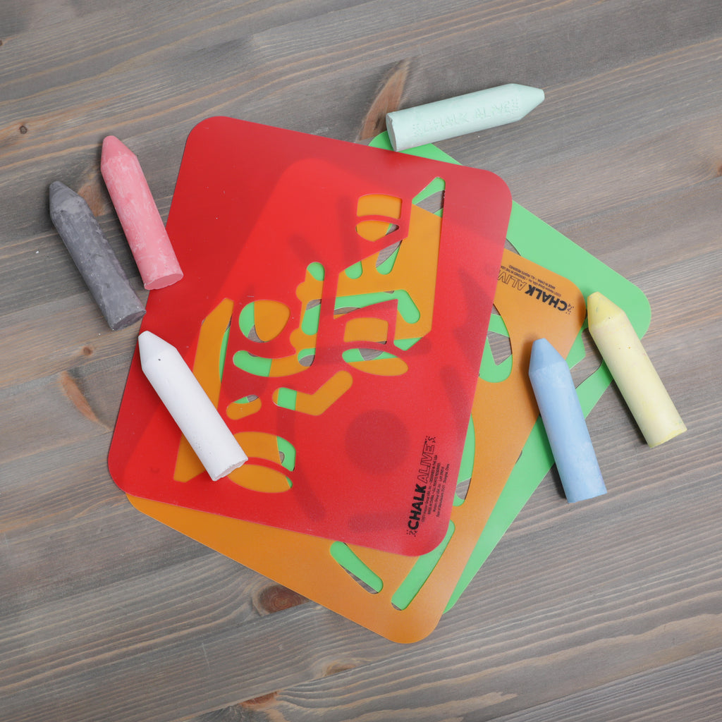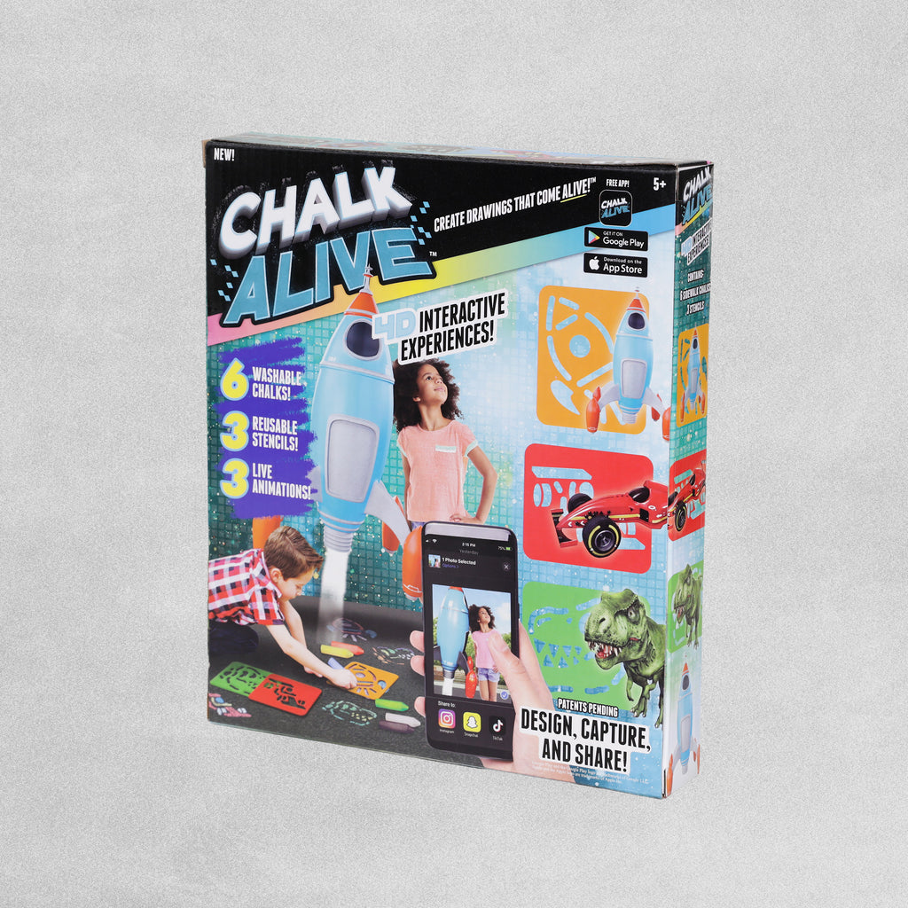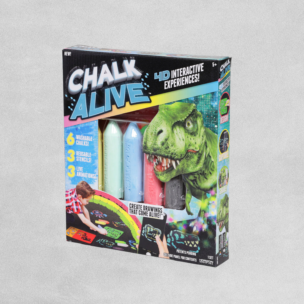 Use the chalks to colour in the Dino, rocket, and race car stencils. Then, download the free, interactive Chalk Alive mobile app - Android and iPhone compatible. Scan your art, snap a photo using the app, and watch your drawings come alive.