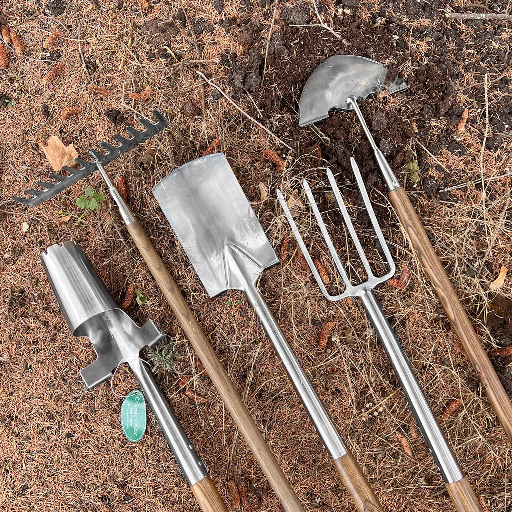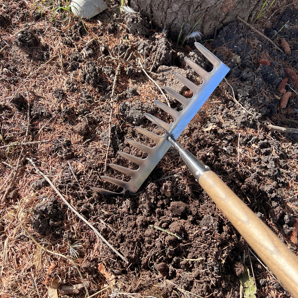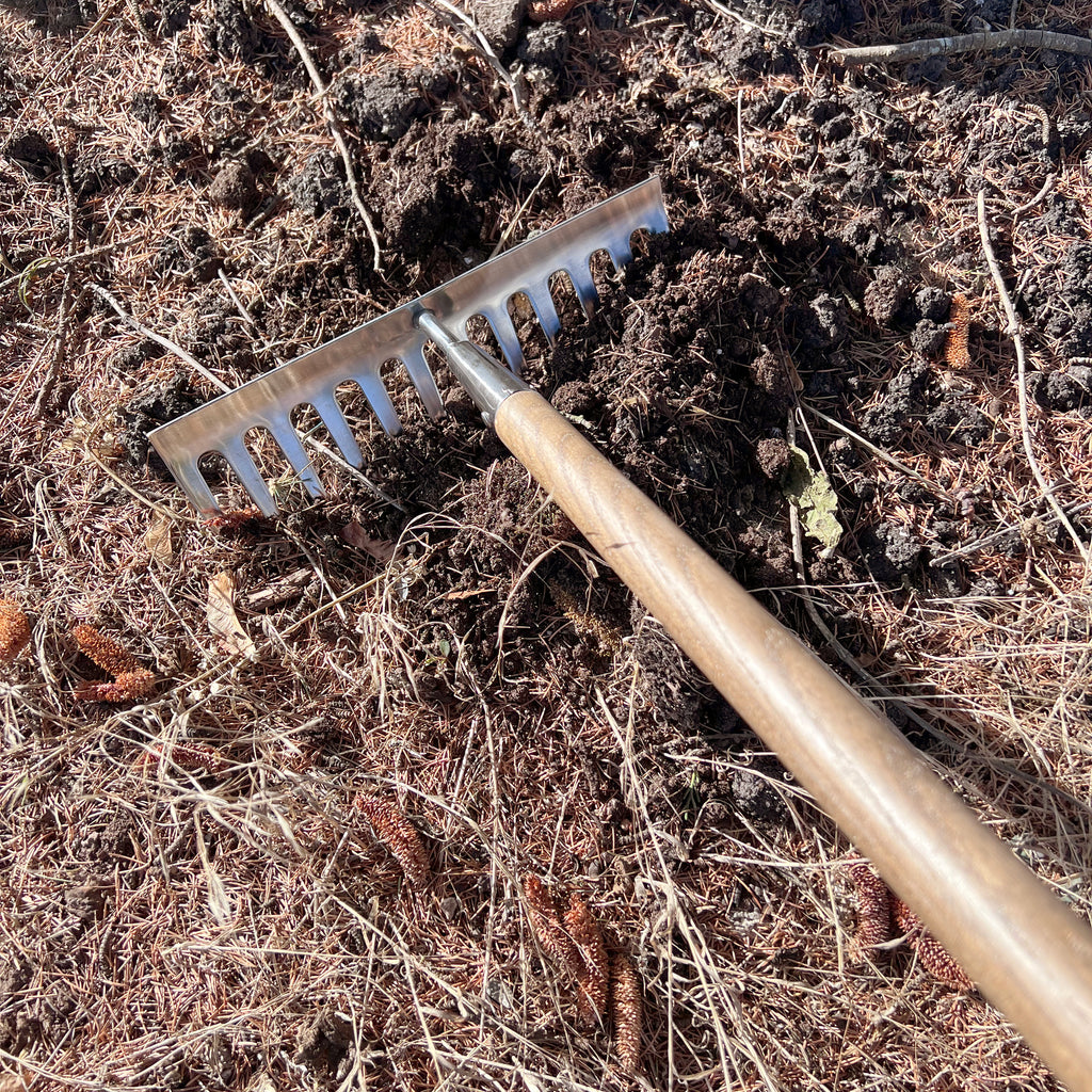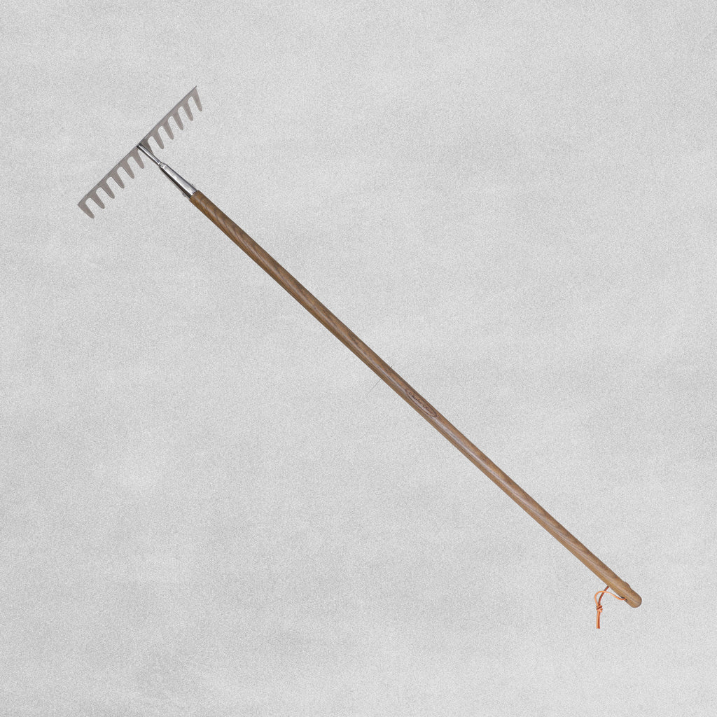 The Charles Rose Rake perfect for levelling soil, breaking up clumps, aerating beds, and preparing seedbeds in garden areas. Its polished stainless steel head offers strength and durability, making it a reliable choice for regular use.