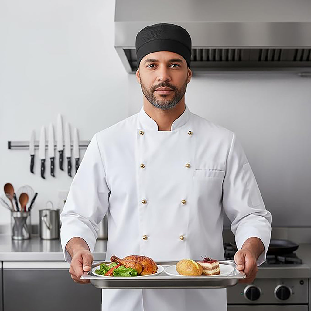 The S899 Skull Cap gives a stylish addition to the Chefswear range. Plastic snapback adjustment gives a comfortable fit and the Kingsmill fabric guarantees maximum performance.