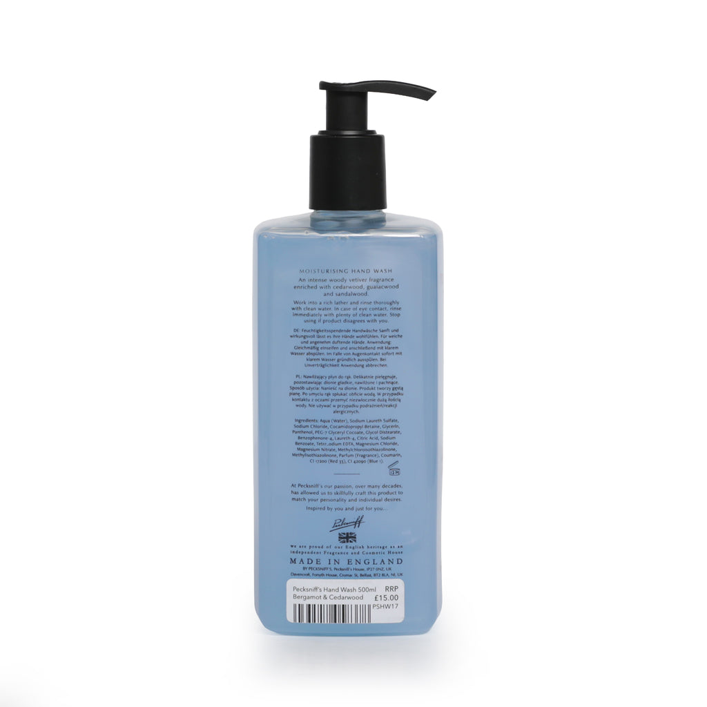 Pamper yourself with Pecksniff's Moisturising Hand Wash. The aromatic Bergamot and Cedarwood is infused with an intense woody vetiver fragrance which is enriched with cedarwood, guaiacwood and sandalwood.. The moisturising hand wash cleanses effectively while providing hydration to your skin. It removes dirt, germs and impurities without drying or irritating your skin.