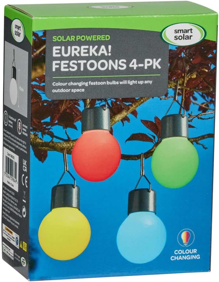 Add a splash of colour to your gardens with this pack of 4 solar powered individual festoon style bulbs. Lightweight, versatile, and completely wire-free, these clever little lights are perfect for bringing ambient lighting to gardens, patios, tents, or parasols.