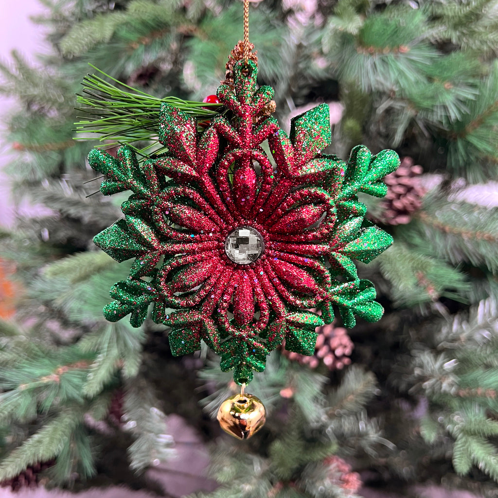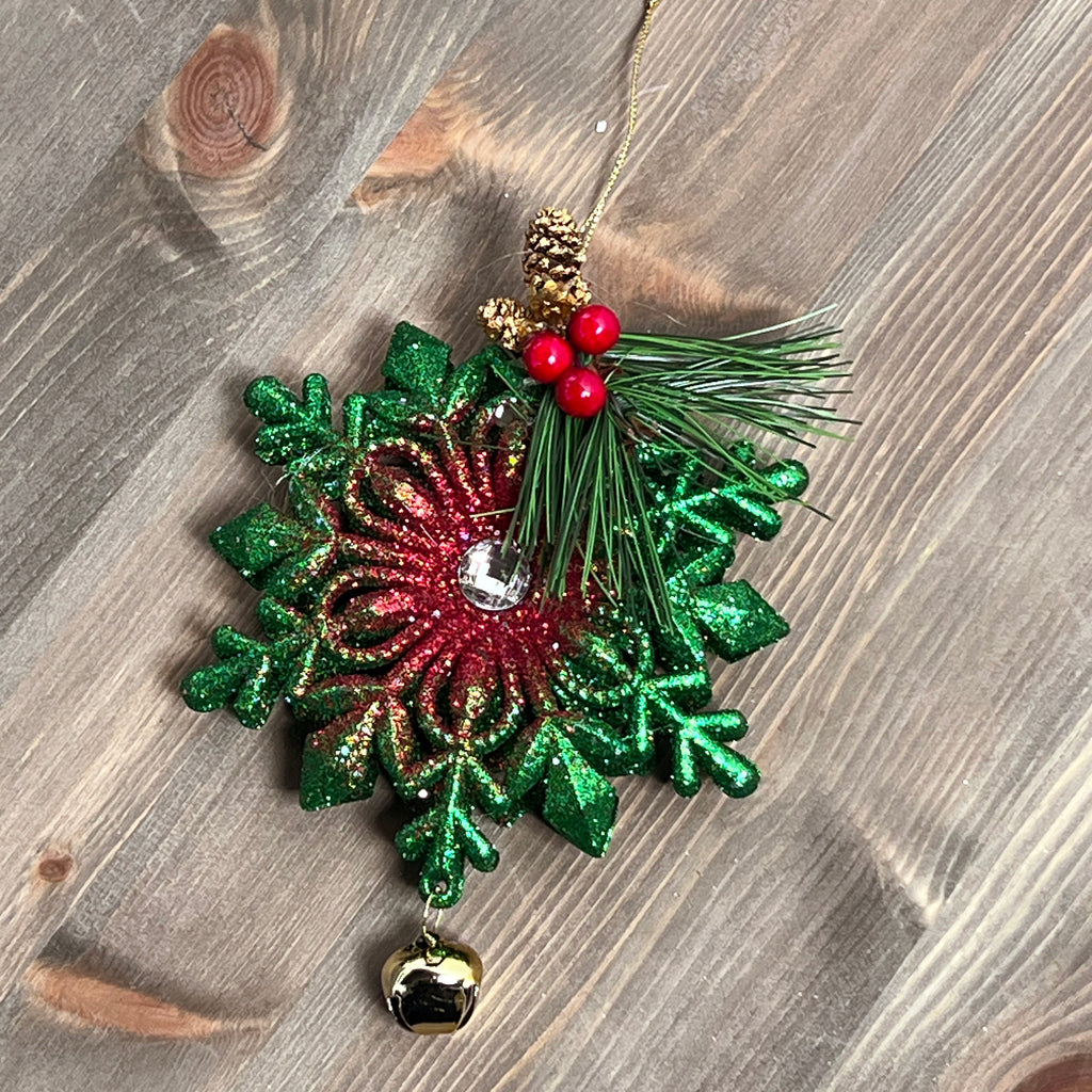 Bring festive sparkle and charm to your tree with this Hanging Green Glitter Snowflake. Designed with a detailed snowflake shape, shimmering green glitter and topped with red berries and a pine cone accent, it captures the magic of Christmas perfectly.