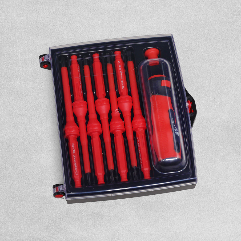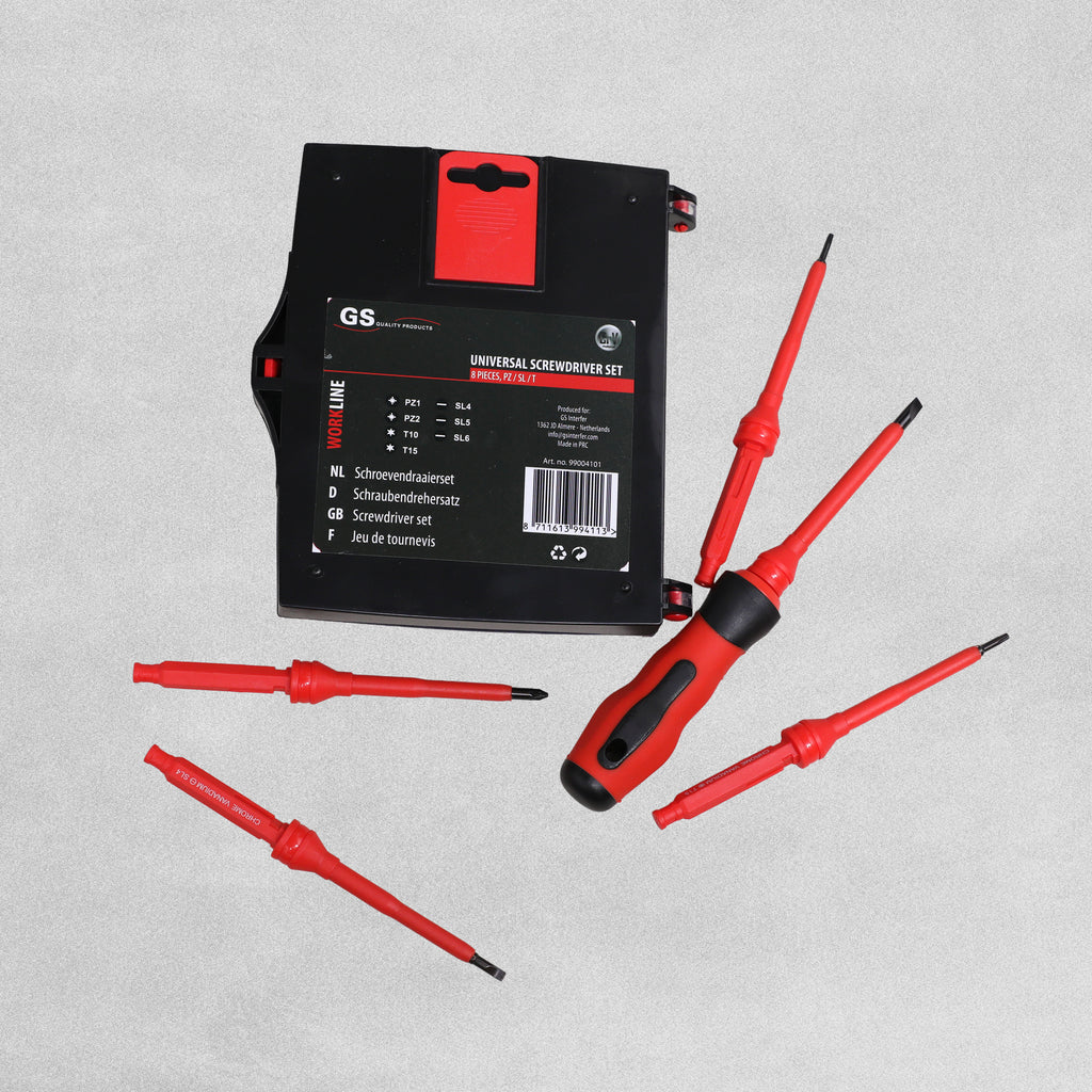 - Universal 8 piece screw Driver Set includes a combination of slotted (flat), Torx and Pozidriv.