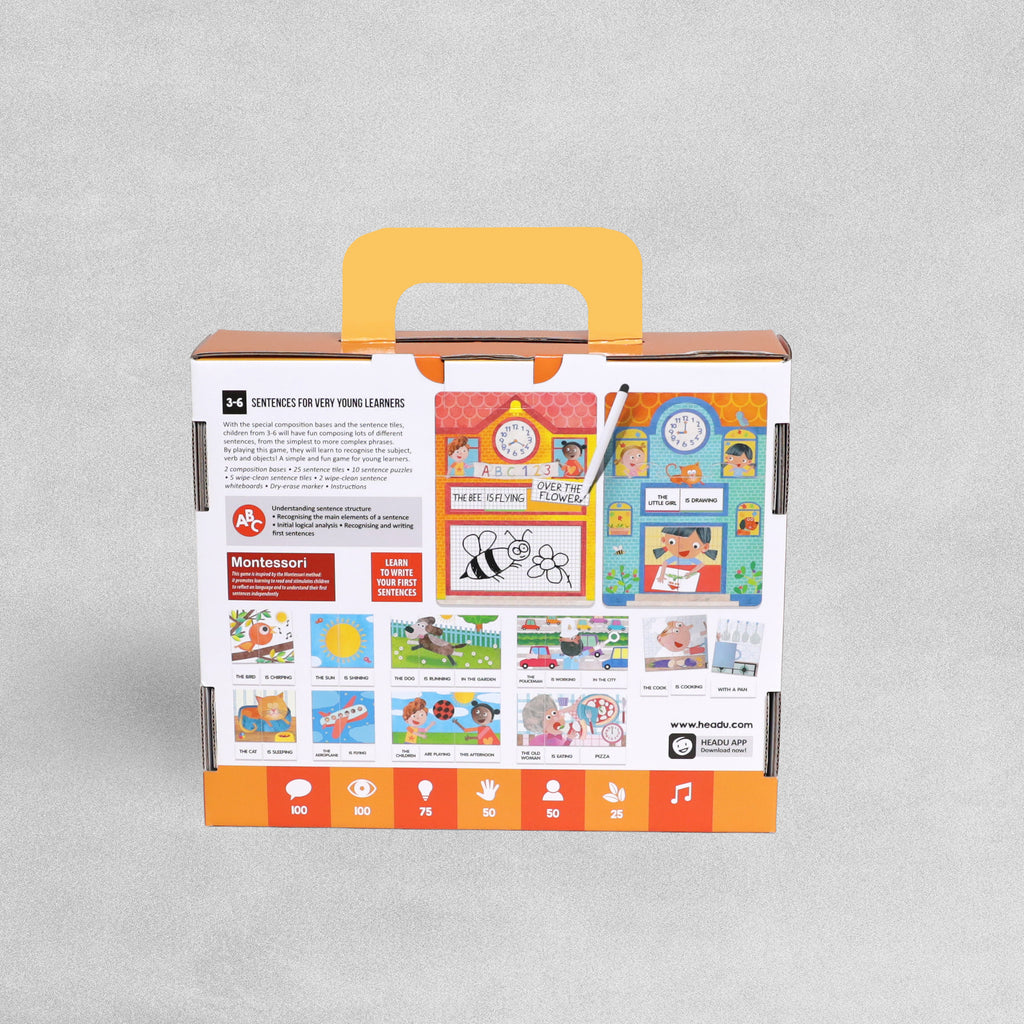 With the special composition bases and the sentence tiles, children from 3-6 will have fun composing lots of different sentences, from the simplest to more complex phrases. By playing this game, they will learn to recognise the subject, verb and objects! A simple and fun game for young learners.