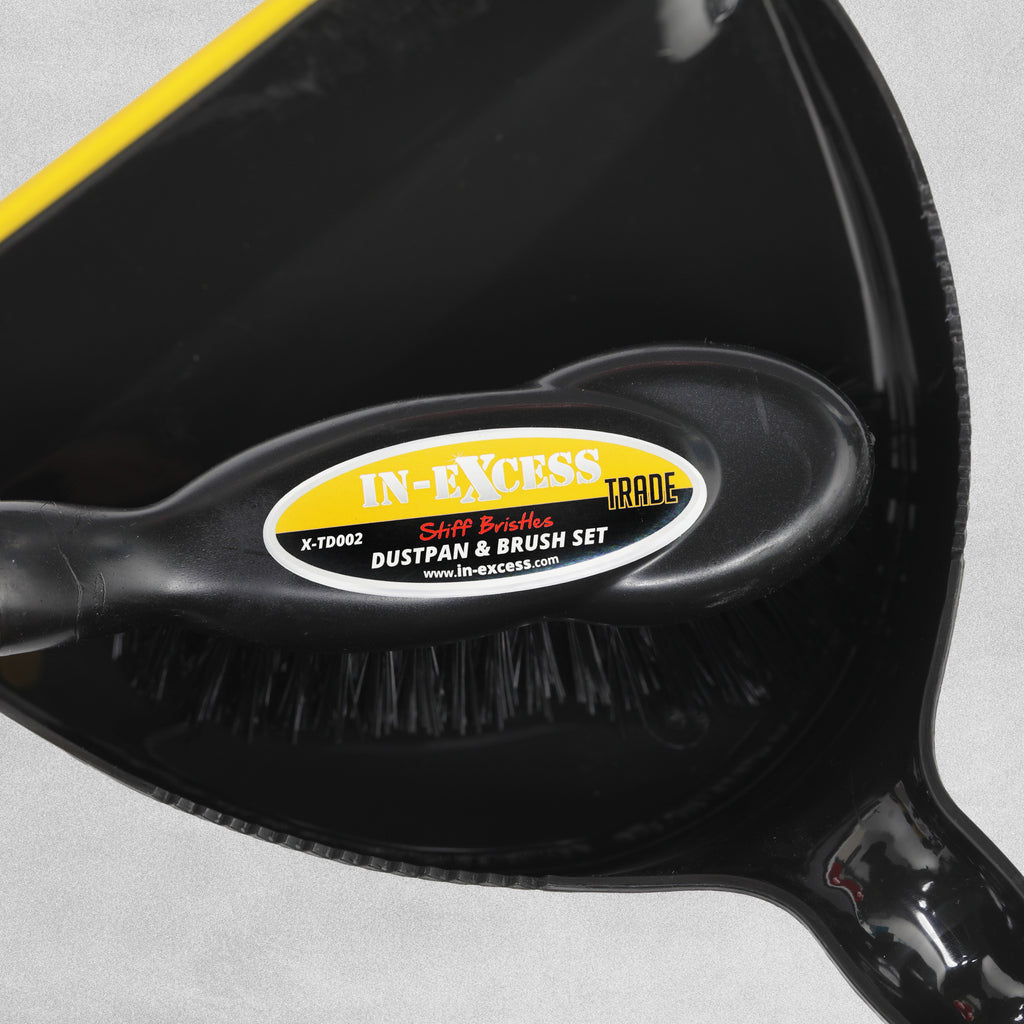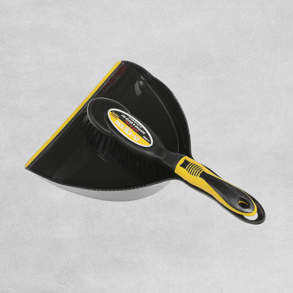 - Black dustpan with Yellow lip and black brush with yellow grip and black bristles