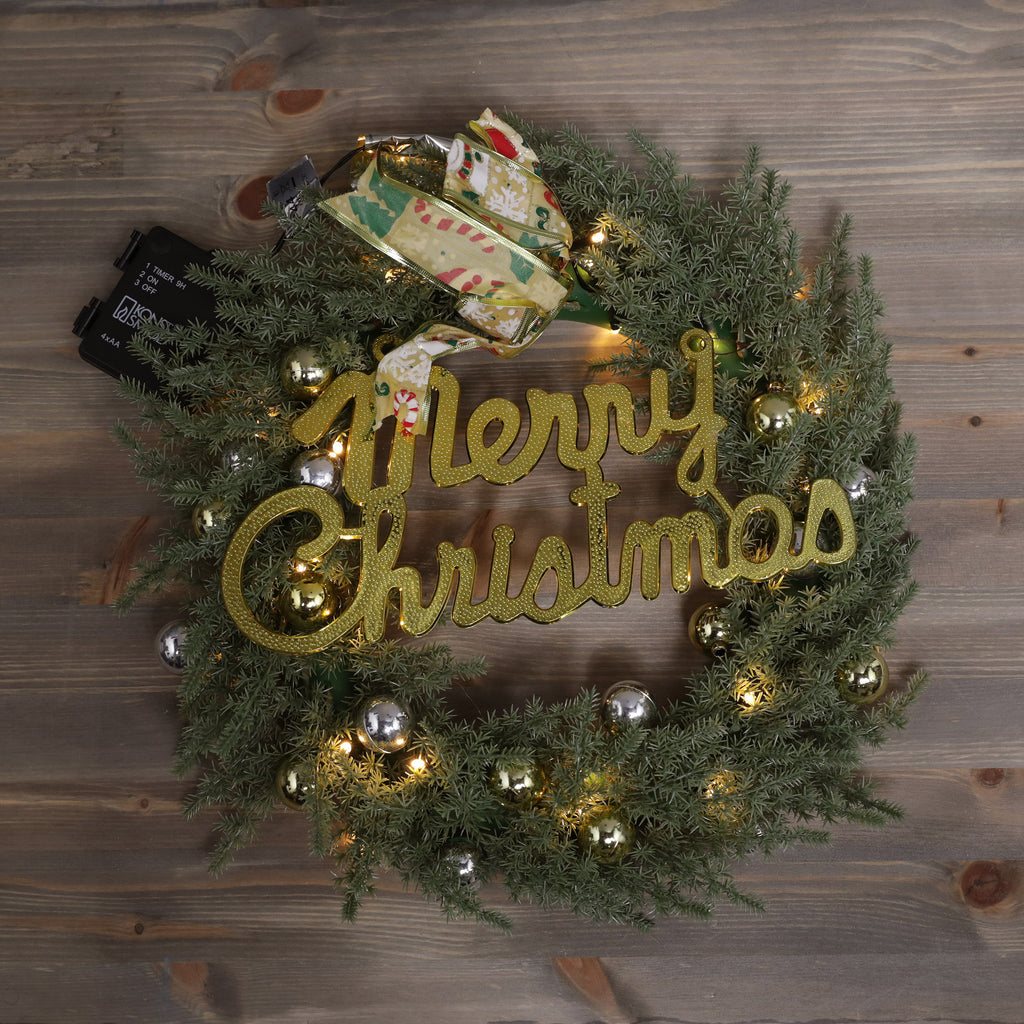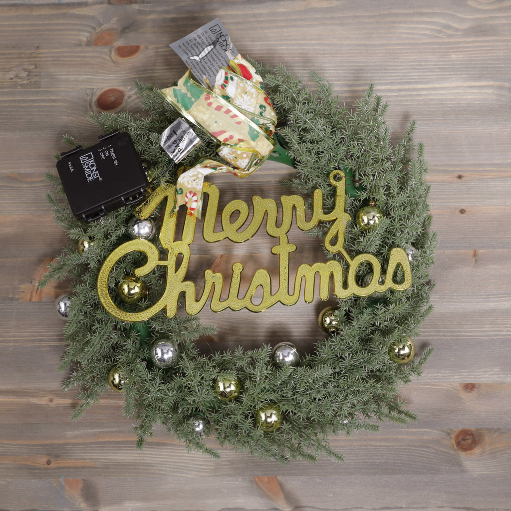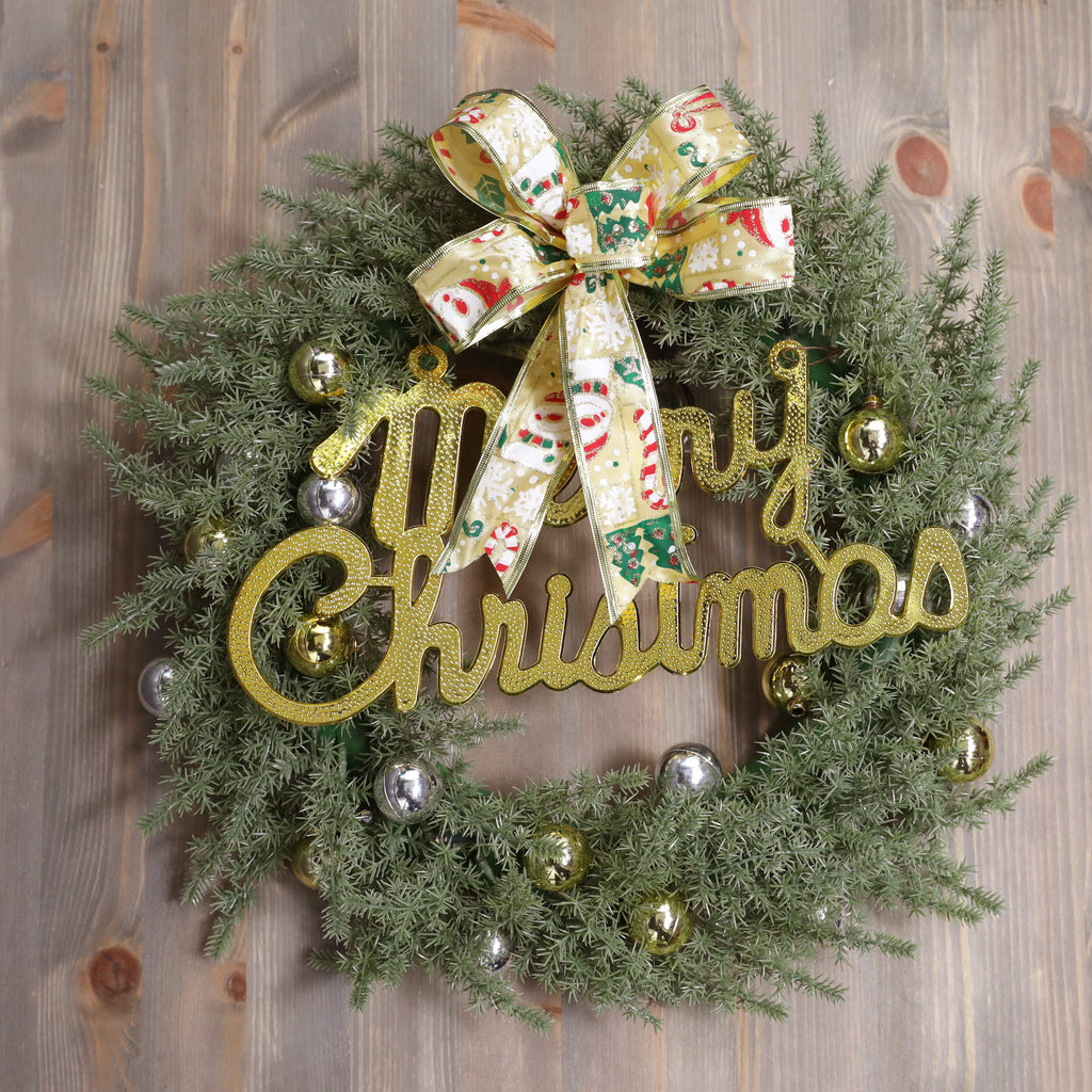 The perfect wreath to hang from your door and welcome family and friends into your home this season, this wreath combines traditional Christmas aesthetics with a rustic feel. Covered with Ribbon ,shining gold baubles and Merry Christmas all held together by traditional foliage, the twine hanging loop complete this wreath.