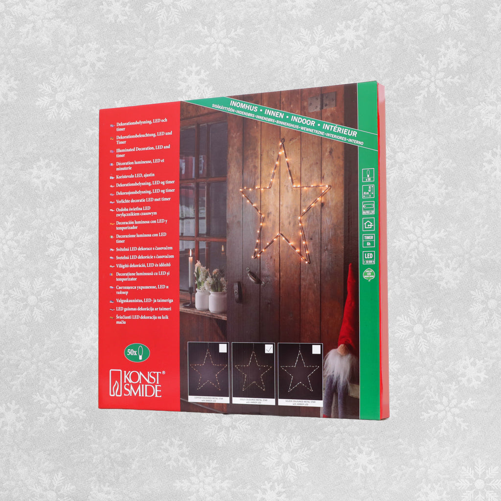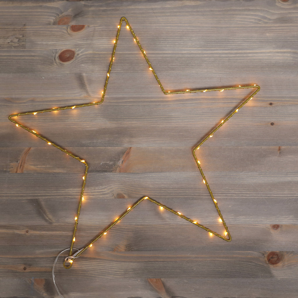 Konstsmide hanging star light has gold finish with amber LED's and will give your indoor living space a warm festive glow this winter and is with operated by an on/off timer switch.