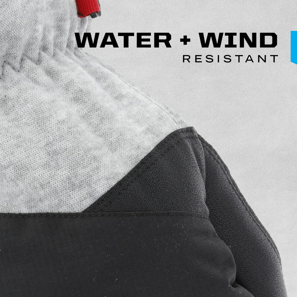 - Lightweight fleece outer with water and wind resistant soft shell back of hand protection.
