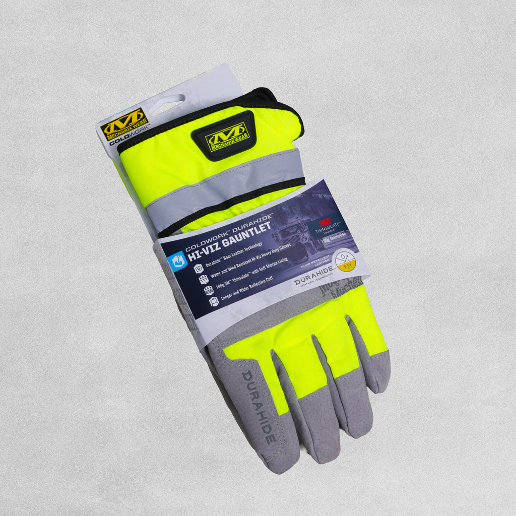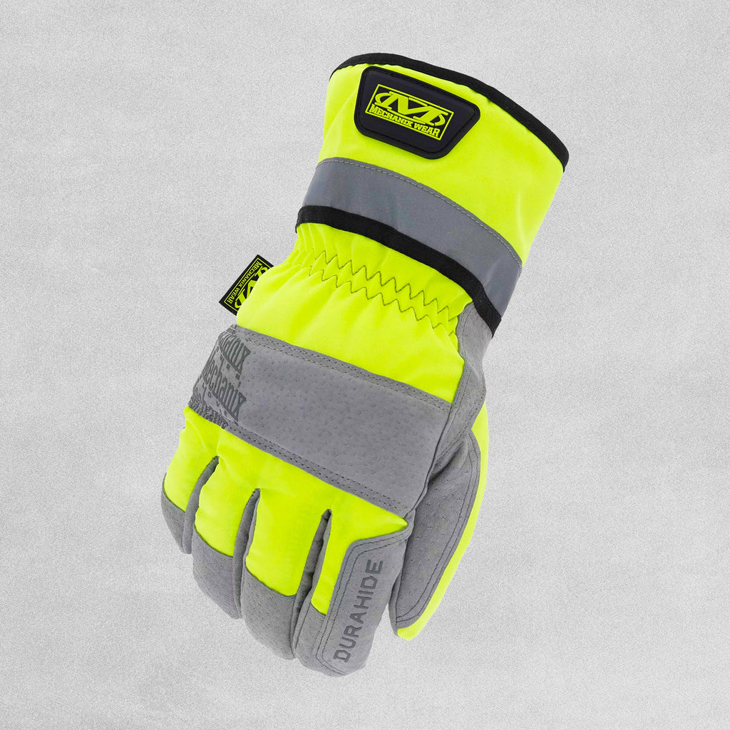 The ColdWork Hi-Viz Canvas Leather Gauntlet work gloves leverage fluorescent and 3M Scotchlite reflective materials to ensure maximum visibility in hazardous and low light work environments. The heavy duty C6 treated canvas, water-resistant and wind proof Hi-Viz poly shell, Durahide™ leather palm helps repel water and oily substances while the 100g 3M™ Thinsulate™ insulation delivers essential warmth when working in the coldest conditions. This versatile work glove features 3mm EVA knuckle padding, gunn cut finger design for improved durability and a longer wider cuff for easy use with heavy jackets.