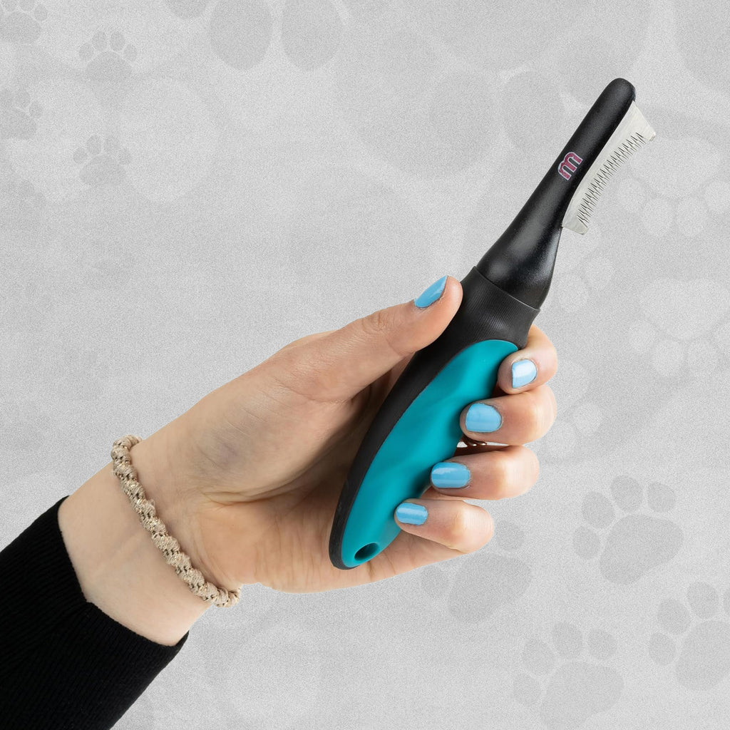 Say goodbye to matting, shedding, and tangles - the Mikki Easy Grooming Knife restores your pet's coat to its former glory with just a few gentle strokes. There's a cutting blade on both sides for left and right handed users and features a heat treated stainless steel blade for extra strength and durability.