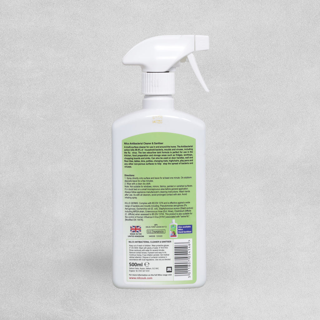 Nilco Antibacterial Cleaner and Sanitiser is a multi-surface cleaner for use in and around the home. The antibacterial action kills 99.9% of household bacteria, moulds and viruses including the flu virus. The low odour/low taint formula is perfect for use in the kitchen, food preparation and storage areas such as fridges, worktops, chopping boards and sinks.
