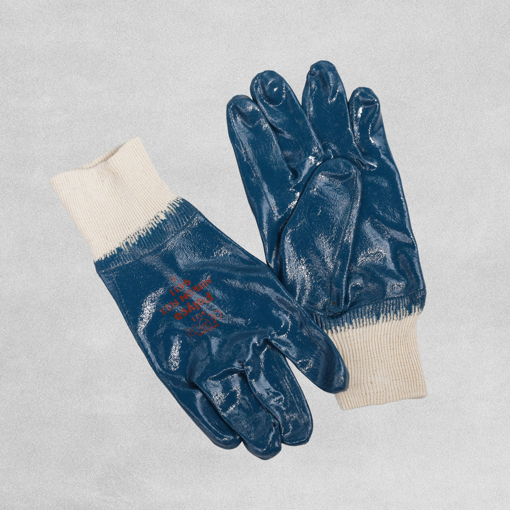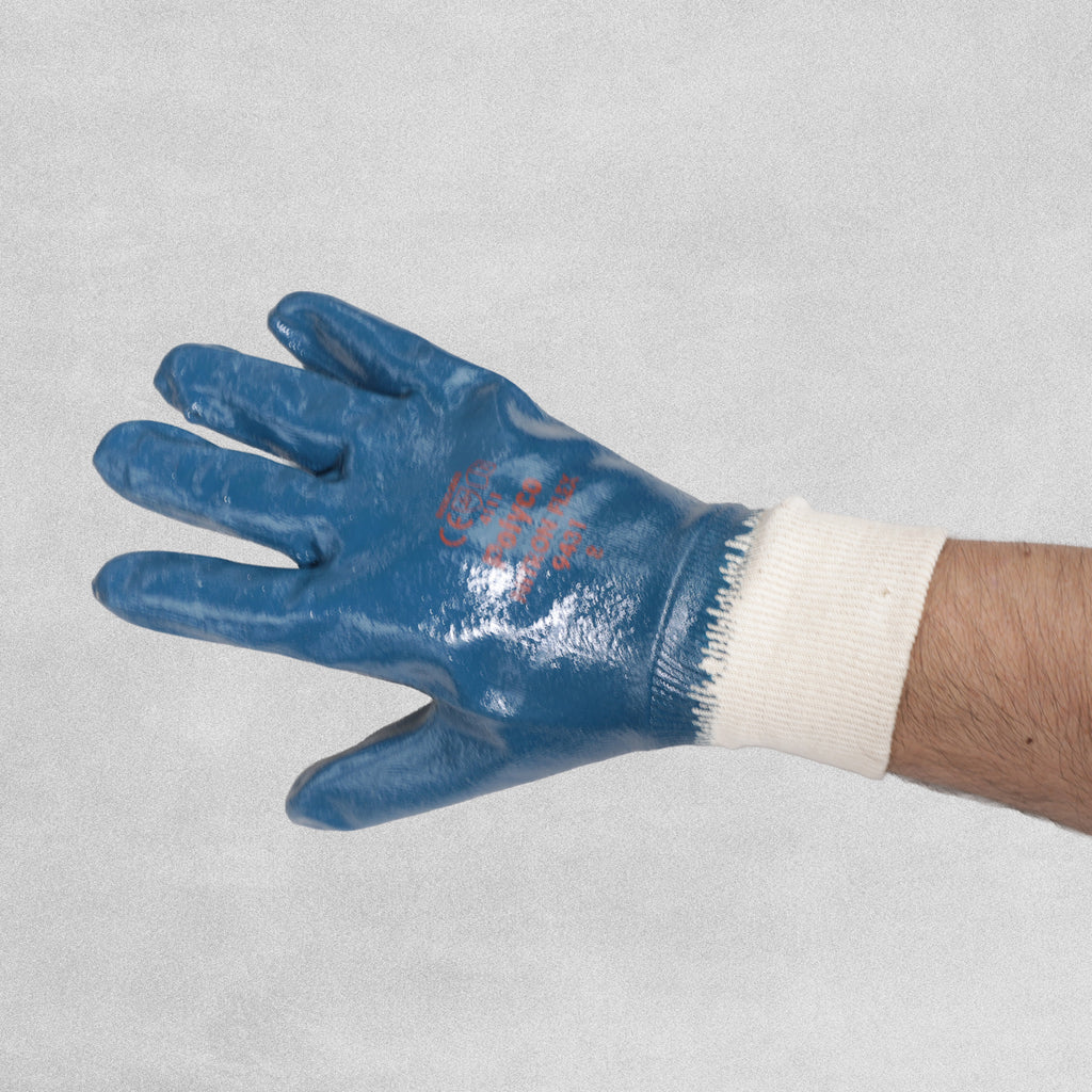 Polyco 9431 Nitron Gloves: These are mechanical hazard gloves that are nitrile-coated for protection, with a cotton liner for comfort, and are blue in color.