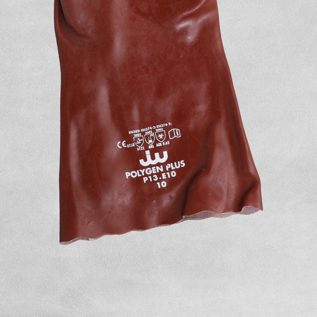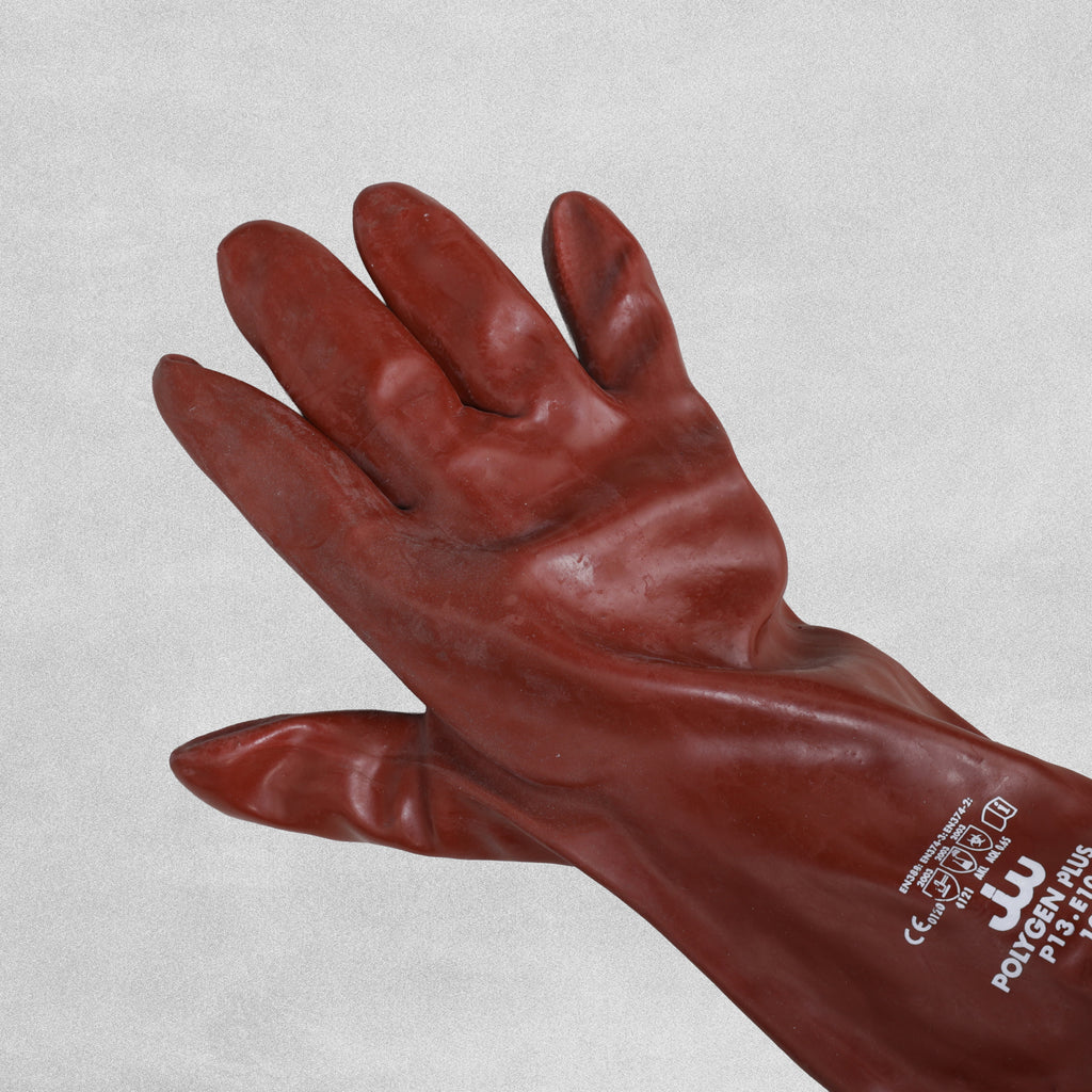 Polygen Plus™ is a red PVC glove and gauntlet with cotton interlock knitted liner. The PVC gauntlet performs well to protect against a variety of chemicals. It attains maximum EN388 score for abrasion resistance and offers good tear resistance, helping to enhance the glove’s mechanical protection and durability. The cotton interlock knitted liner offers easy donning and provides exceptional comfort keeping the hands cool and comfortable, and its anatomical shape and flexibility minimises hand fatigue. With good chemical and mechanical properties, this cost effective and robust glove offers excellent durability and long life expectancy. The gauntlet style comes in two different lengths for when forearm protection is required (27cm & 35cm).