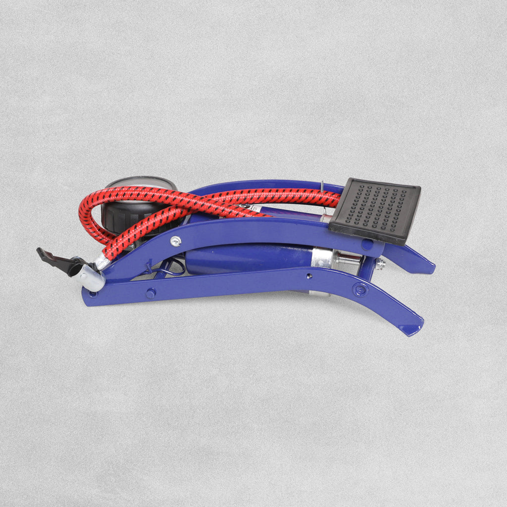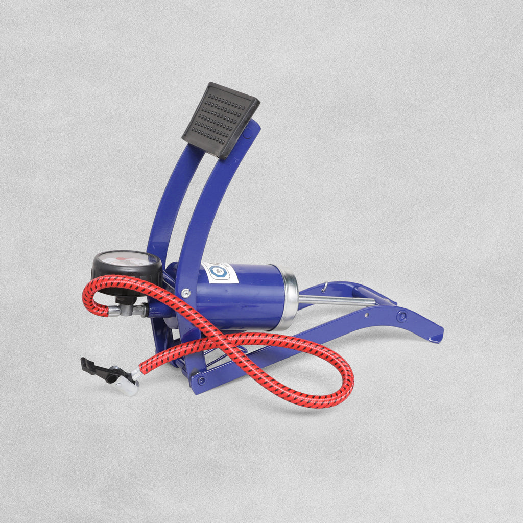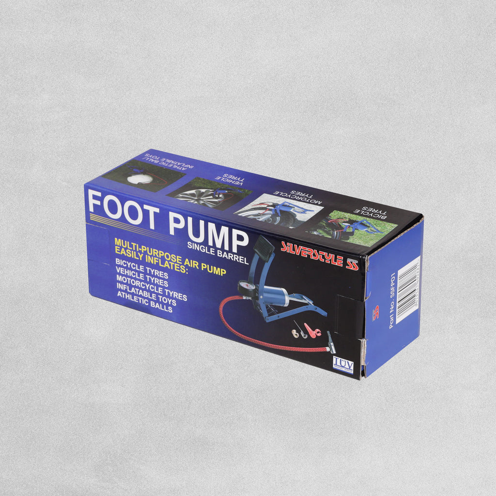 Single barrel foot pump. This multi purpose air pump easily inflates: bicycle tyres, vehicle tyres, motorcycle tyres, athletics balls, inflatable toys and more! Includes 3 nozzles.
