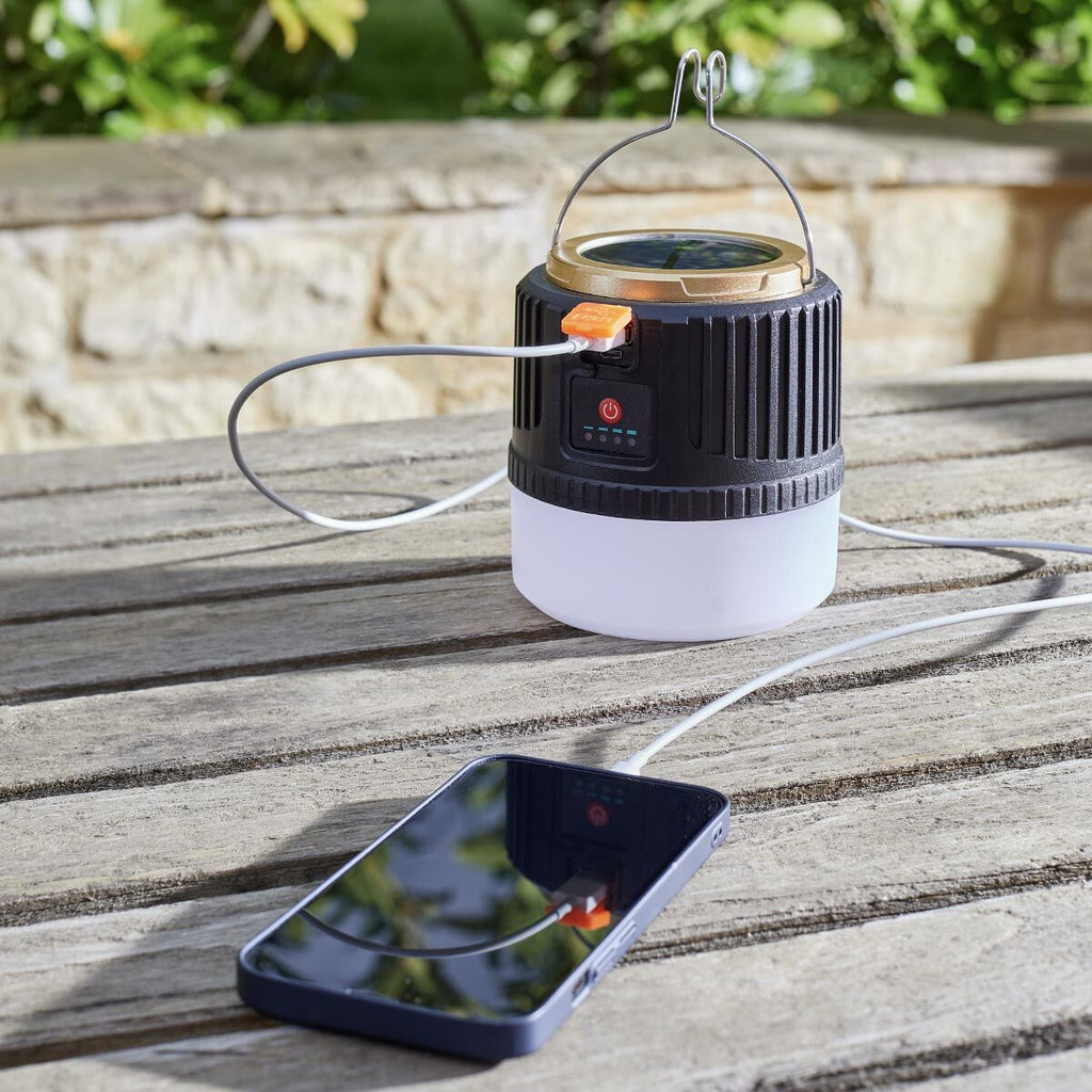 With an attached handle, you can easily hang the lantern from walls, fences, poles, or tents. An integrated solar panel powers the lantern, and it includes 2 x 18650 Li-ion batteries. You can also charge the light using the provided micro-USB port at the bottom, while the top port is meant for charging your devices. This feature makes it an incredibly handy and versatile light for any situation.
