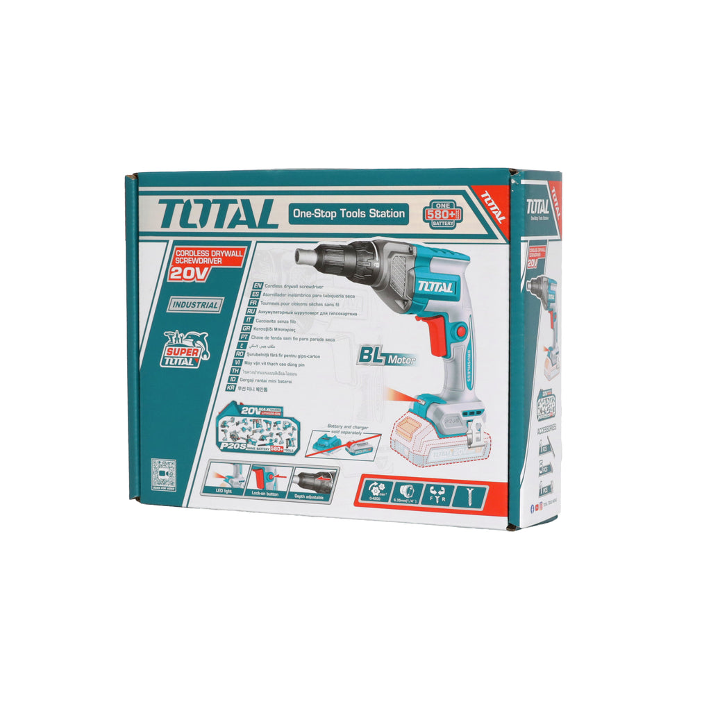 Boost your productivity with the Total Li-Ion 20V Cordless Drywall Screwdriver. This tool is designed for quickly and consistently driving drywall screws without a chord. The key features include a powerful motor and a compact, lightweight design for easy handling and is packaged in a colour box for easy organization. Battery and charger sold separately.