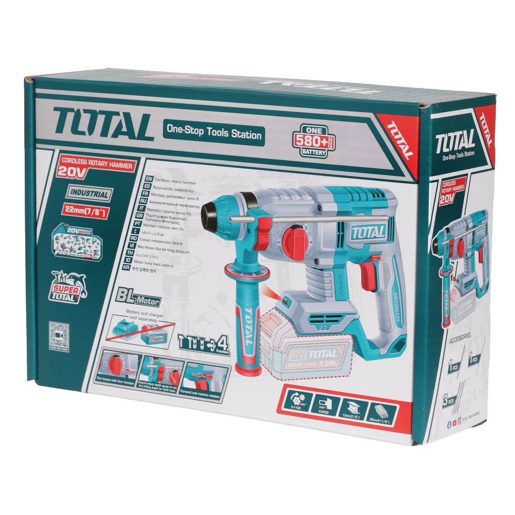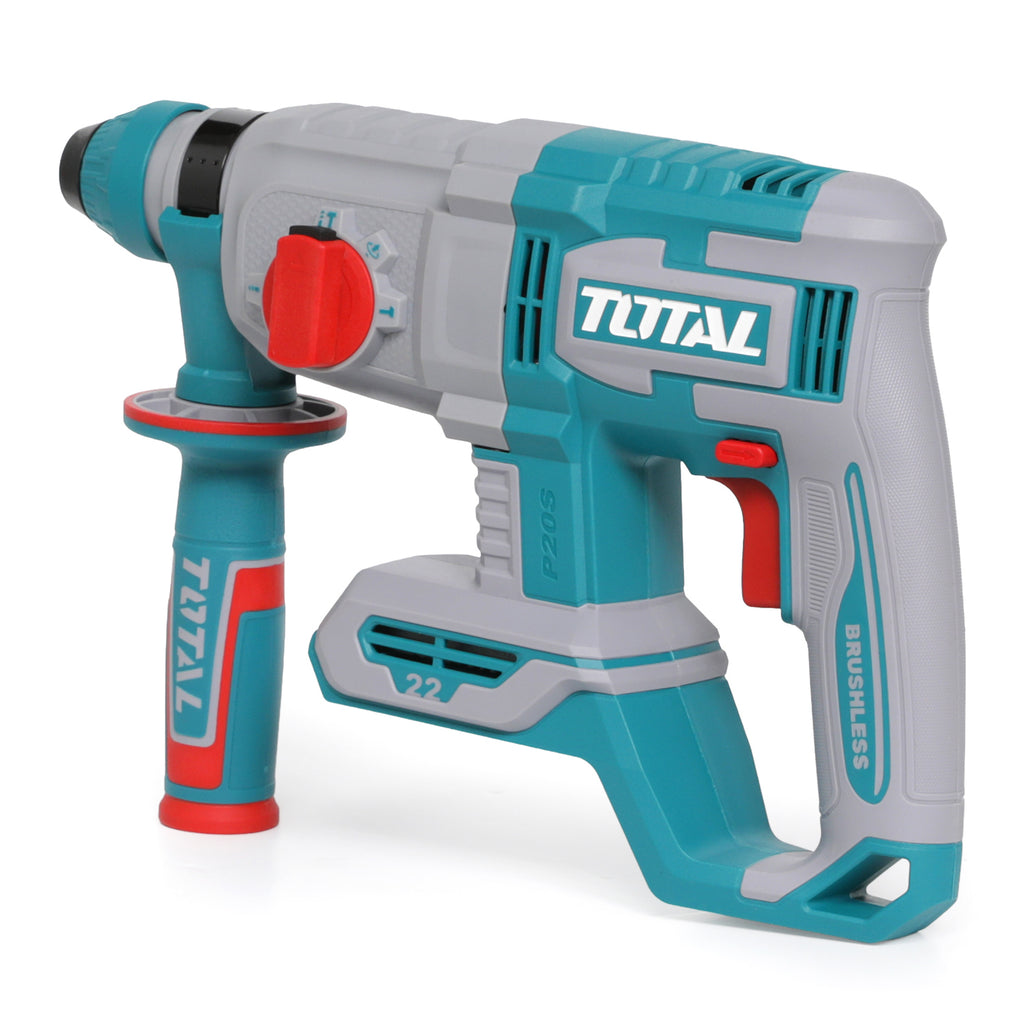 The Total Li-Ion 20V Cordless Rotary Hammer SDS Plus (Battery not included) delivers powerful performance with a brushless motor and 2.0 Joules of impact energy. With four operational functions and variable speed up to 1100 rpm, it handles drilling and chiselling efficiently. The SDS Plus cartridge system enables quick accessory changes, while the built-in work light and auxiliary handle enhance precision and control. Ideal for concrete (up to 22 mm), steel (13 mm), and wood (28 mm), this lightweight 2.275 kg tool comes with three drill bits and one chisel, making it a versatile choice for demanding tasks.