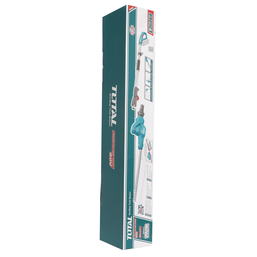 With the Total Li-Ion 20V Pole Hedge Trimmer, achieve up to 3m of maximum reach and precise cuts using a 7-position, 90° pivot head and laser cut blade. Experience a max speed of 2800 / min and a cutting diameter of 18mm with a 460mm (18") blade length.