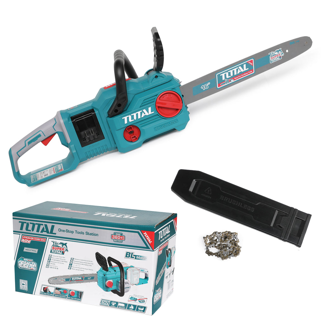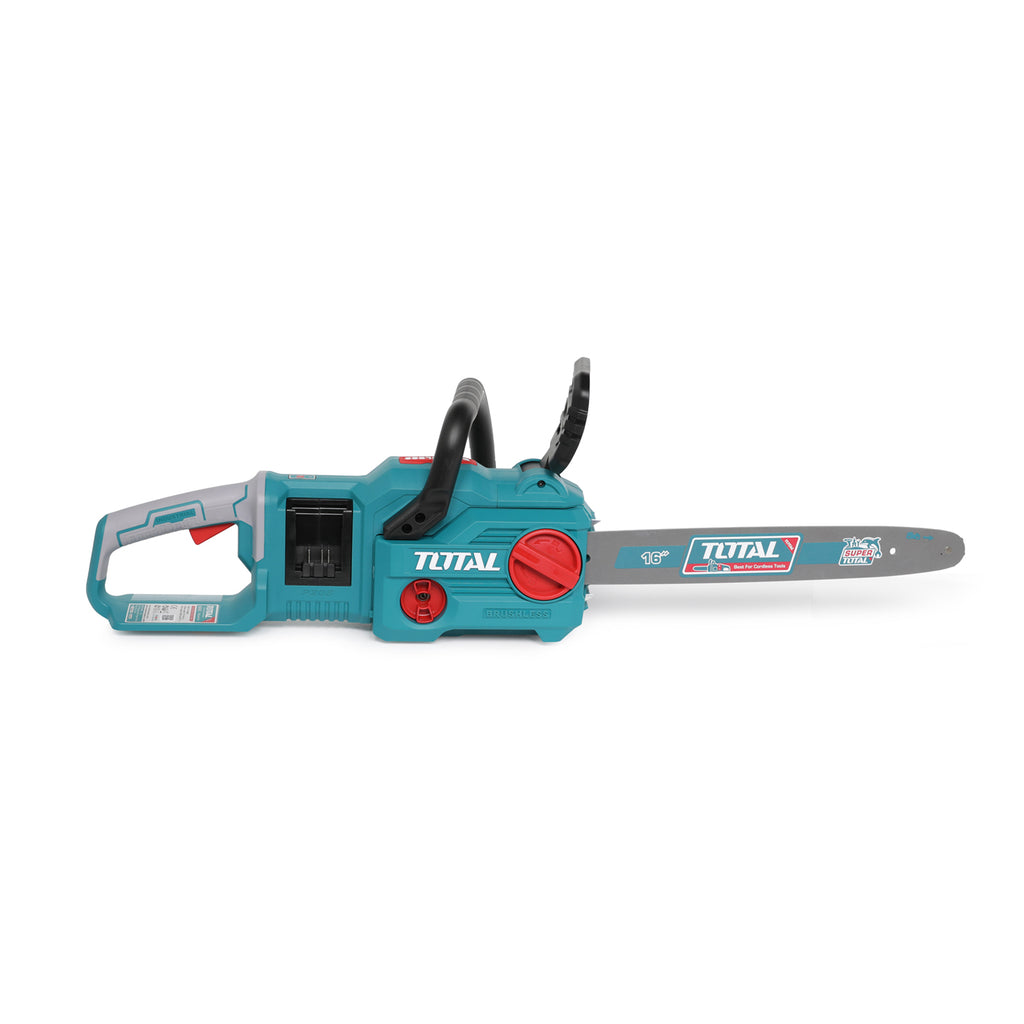 The Total Li-Ion 40V Chain Saw combines a brushless motor with a 14.5 m/s chain speed to deliver efficient and powerful cutting. It features a 16" (400mm) bar with a 3/8" pitch and 0.043" gauge chain. Designed for ease of use and safety, it includes a quick stop chain brake, tool-free chain tensioning, and an auto chain lubrication system with a 170ml oil tank. Operating at 104dB sound power, this 4.65kg saw requires two 20V batteries (not included) to provide 40V of cordless power ideal for both professional and demanding applications.