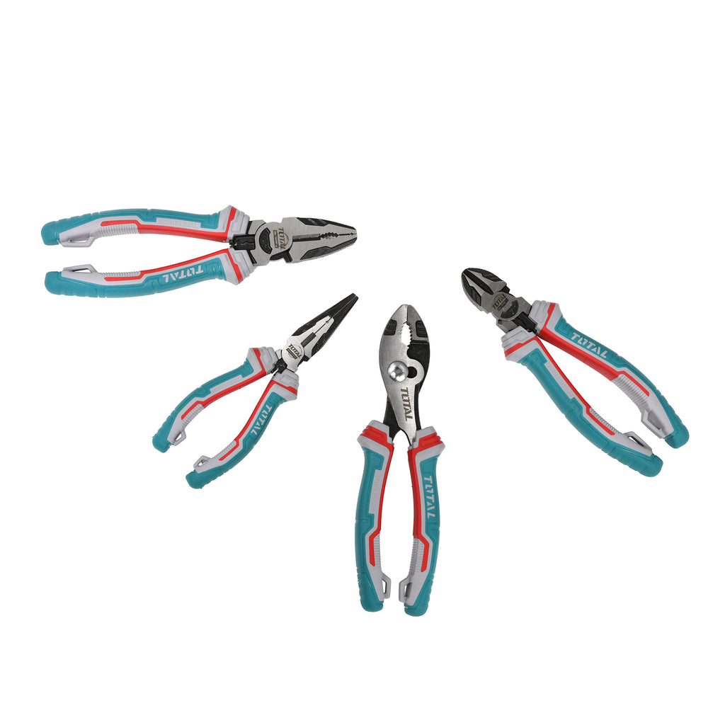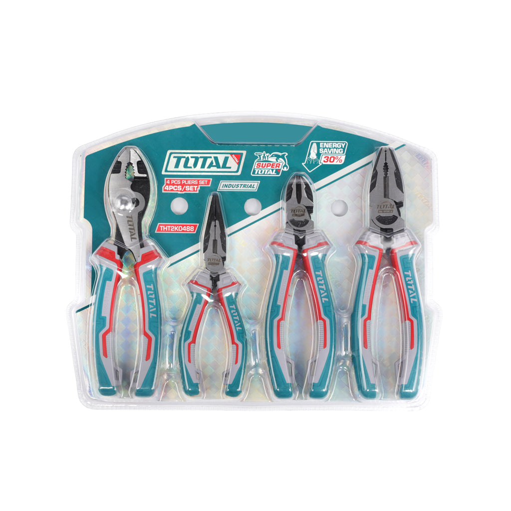 The Total Pliers Set is constructed from durable chromium vanadium steel for long-lasting performance and reliability. These pliers feature a multi-functional design with crimping, deburring, nail holding and spanner capabilities for versatile use. The set provides 30% more energy efficiency compared to standard pliers, reducing user fatigue and increasing productivity.