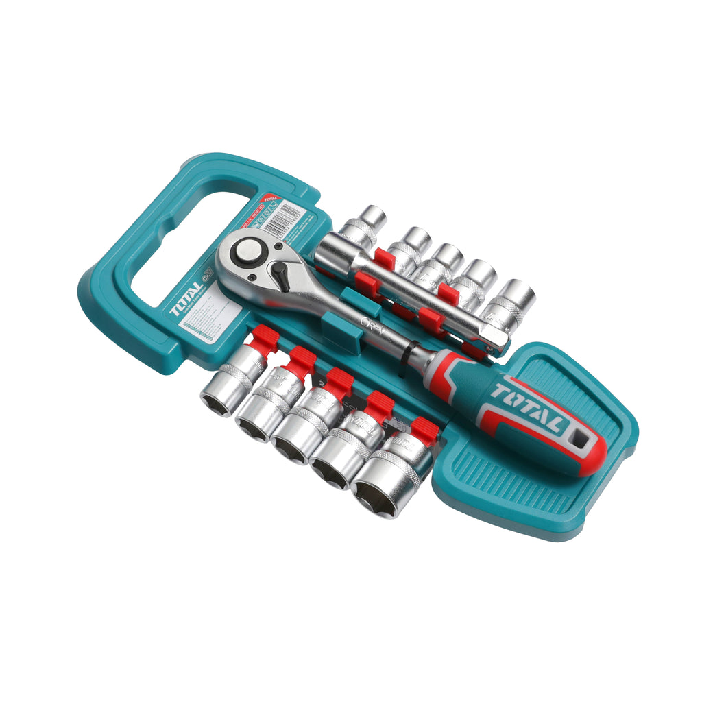 The Total 1/2" 12-piece socket set is a set of tools for mounting, dismantling and doing repair work with threaded connection. The handle with a ratchet mechanism is equipped with a special button, to which the change of heads is faster. The working parts are made of chrome-plated chrome-vanadium steel, which provides the tool with strength and a long service life.