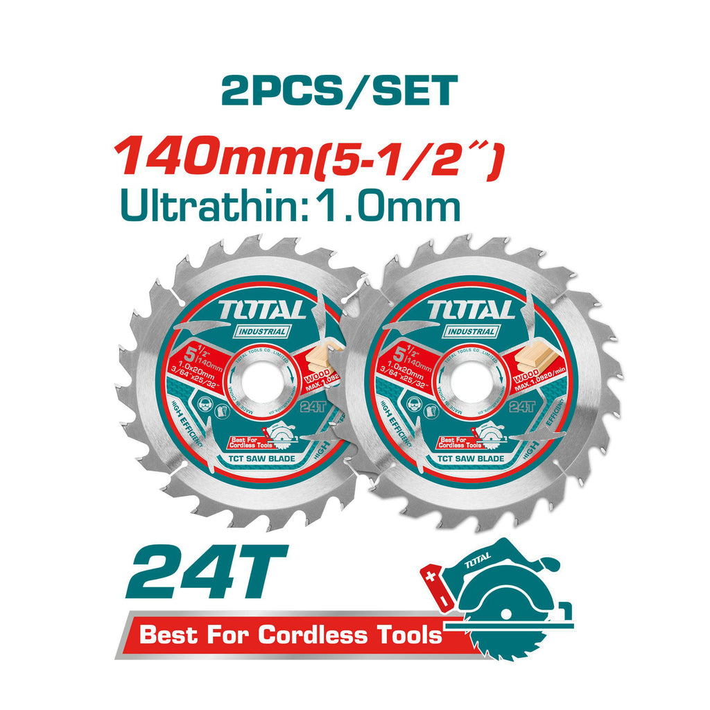 These Total Ultra Thin TCT Saw Blades are ideal to use with cordless hand held saws because the ultra thin body and thin kerf design enables more cuts per battery charge by reducing battery drain. Hardened and tempered steel body with a ground and polished finish that helps eliminate warping and vibration.