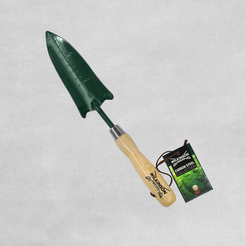 The Wilkinson Sword Carbon Steel Transplanting Trowel has a natural weatherproofed smooth. contoured ash wooden handle and a strong carbon steel head.
