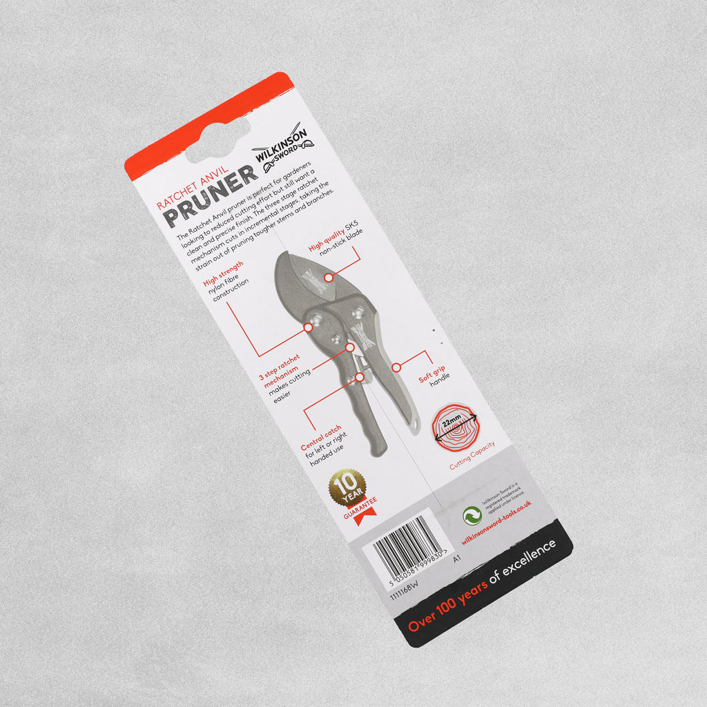 The Wilkinson Sword Ratchet Anvil Pruner is ideal for pruning woody, thick growth, removing branches cleanly and precisely. Anvil pruners close the blade against a softer metal anvil on the lower jaw, whilst the ratchet mechanism prevents any strain on the wrist.