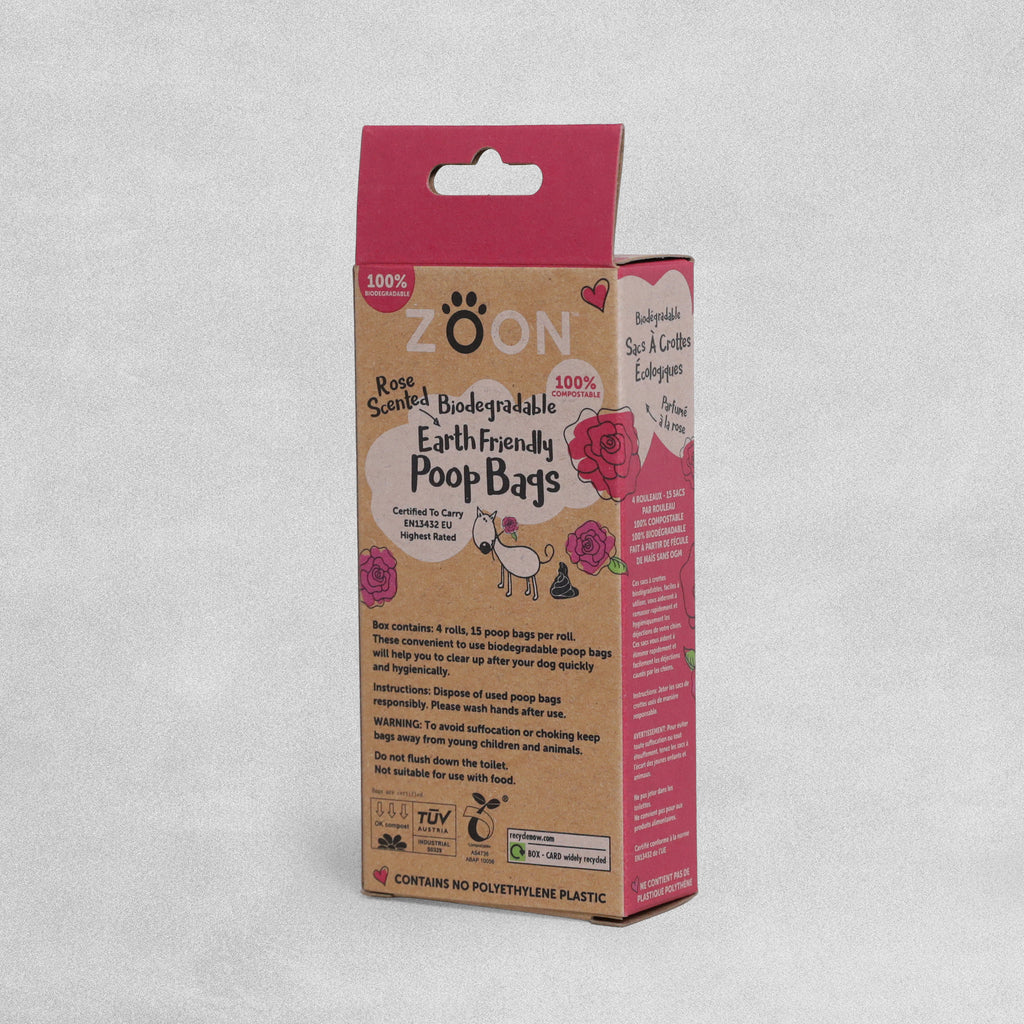 Zoon Bio-Compostable Poop Bags are the environmentally-friendly choice for cleaning up after your pet. Made from high-quality, GM-free corn-starch, these 100% compostable and biodegradable bags feature easy-tie handles and a pleasant rose scent. Say goodbye to harmful plastic and hello to a cleaner planet.